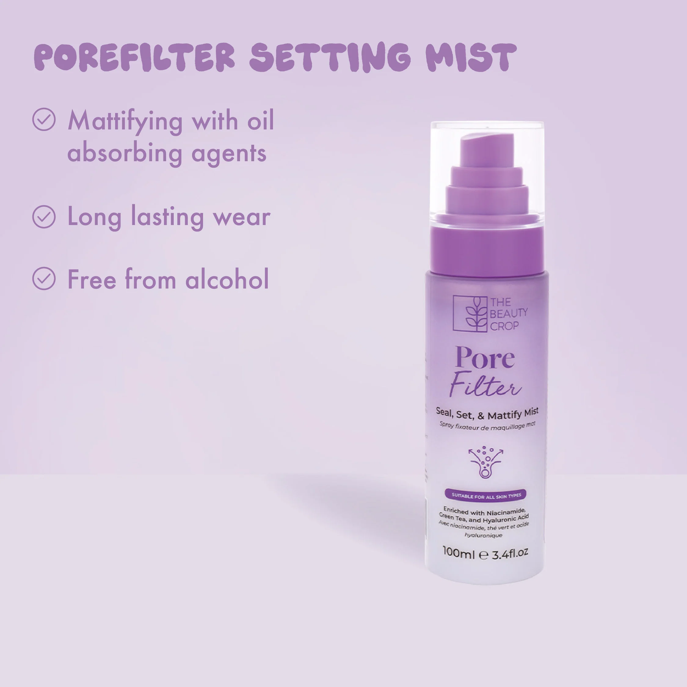 Say goodbye to pesky pores and hello to flawlessly airbrushed skin with our PoreFilter Blot & Porefect Set. Packed with everything you need for a long-lasting matte finish, this four-piece set includes:PoreFilter Pore Blurring Primer: Enriched with Niacinamide and Green Tea, this lightweight, silky primer smooths your skin and controls shine while helping minimise the appearance of pores.PoreFilter Mattifying Setting Mist: Powered by Niacinamide, Green Tea and Hyaluronic Acid, this mist uses fine powders and oil-absorbing agents to mattify skin while polymers lock your makeup in place all day long.PoreFilter Blotting Pressed Powder (Translucent): Talc-free and lightweight, this powder effortlessly absorbs excess oil without adding coverage, keeping shine at bay no matter the day. It's perfect for keeping in your handbag for instant touch-ups anytime, anywhere. Heart-Shaped Powder Puff: Soft to the touch and perfectly shaped for effortless application. Get ready to shine - not with oil, but with confidence that your makeup will last all day and night with this must-have mattifying set!
