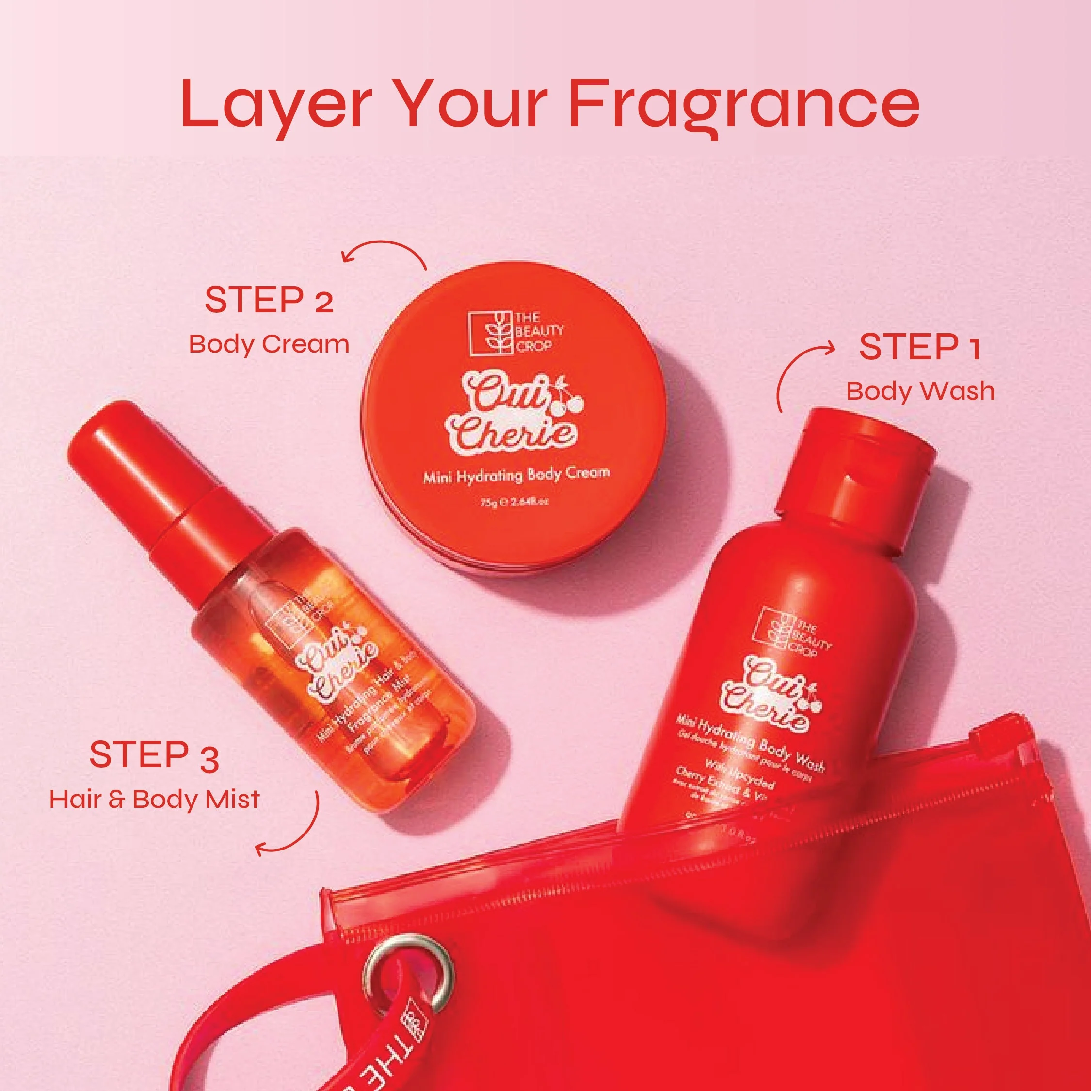 Say hello to your new favourite cherry-scented trio - the Oui Cherie Mini Hydrating Body & Fragrance Set.Inspired by our bestselling Oui Cherie Setting Mist, this set has everything you need to cleanse, hydrate and leave your skin with a burst of juicy cherry goodness.Start with the Hydrating Body Wash that gently cleanses without stripping your skin. Lock in moisture with the velvety-rich Hydrating Body Cream, then finish with the Hair & Body Fragrance Mist - a light, refreshing spritz bursting with notes of Cherry, Brazilian Orange, Mandarin, Jasmine, Pink Pepper, Lemon Leaf, White Musk, Amber and Sandalwood.With antioxidant-rich Cherry Extract and soothing Vitamin E in every step, this set is perfect for pampering your skin while wrapping yourself in a scent so good, compliments are guaranteed.Plus, its travel-friendly size makes it ideal for taking with you on the go, so you can top up your favourite scent anytime, anywhere.