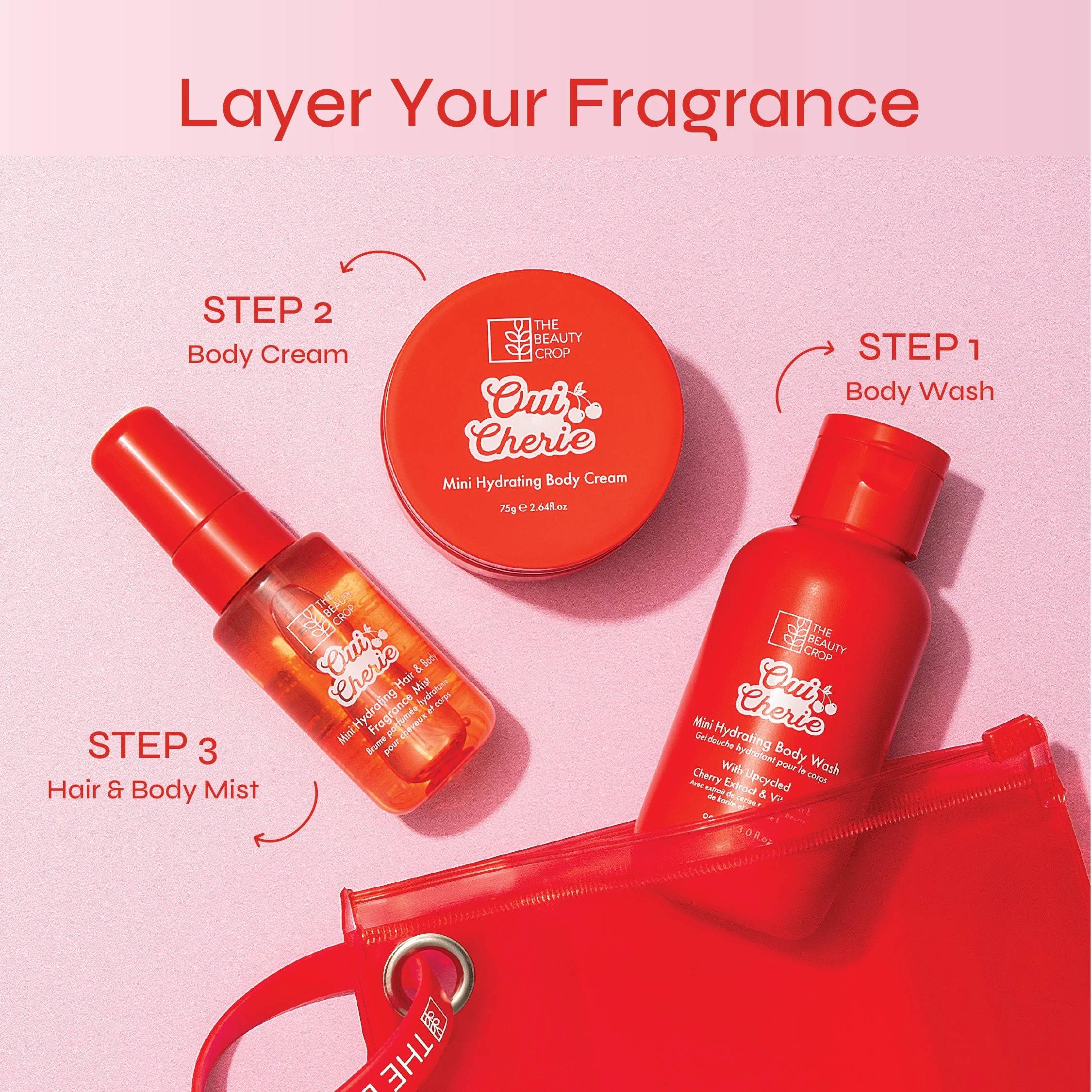 Discover the cherry on top of your self-care routine with our Oui Cherie Hydrating Body Cream.Infused with antioxidant-rich Cherry Extract, moisturising Shea Butter and soothing Vitamin E, this irresistible body cream delivers deep hydration and nourishment to your skin. Its velvety-rich texture melts effortlessly into the skin without any heaviness or greasiness, leaving you feeling luxuriously soft,p pampered and wrapped in the sweet, uplifting scent of fresh cherries.Perfect for daily indulgence, it transforms your skincare ritual into a moment of pure bliss - because your skin deserves to feel it's very best.Available in both a full size for daily use and a travel-friendly mini to maintain your routine whilst on the go.