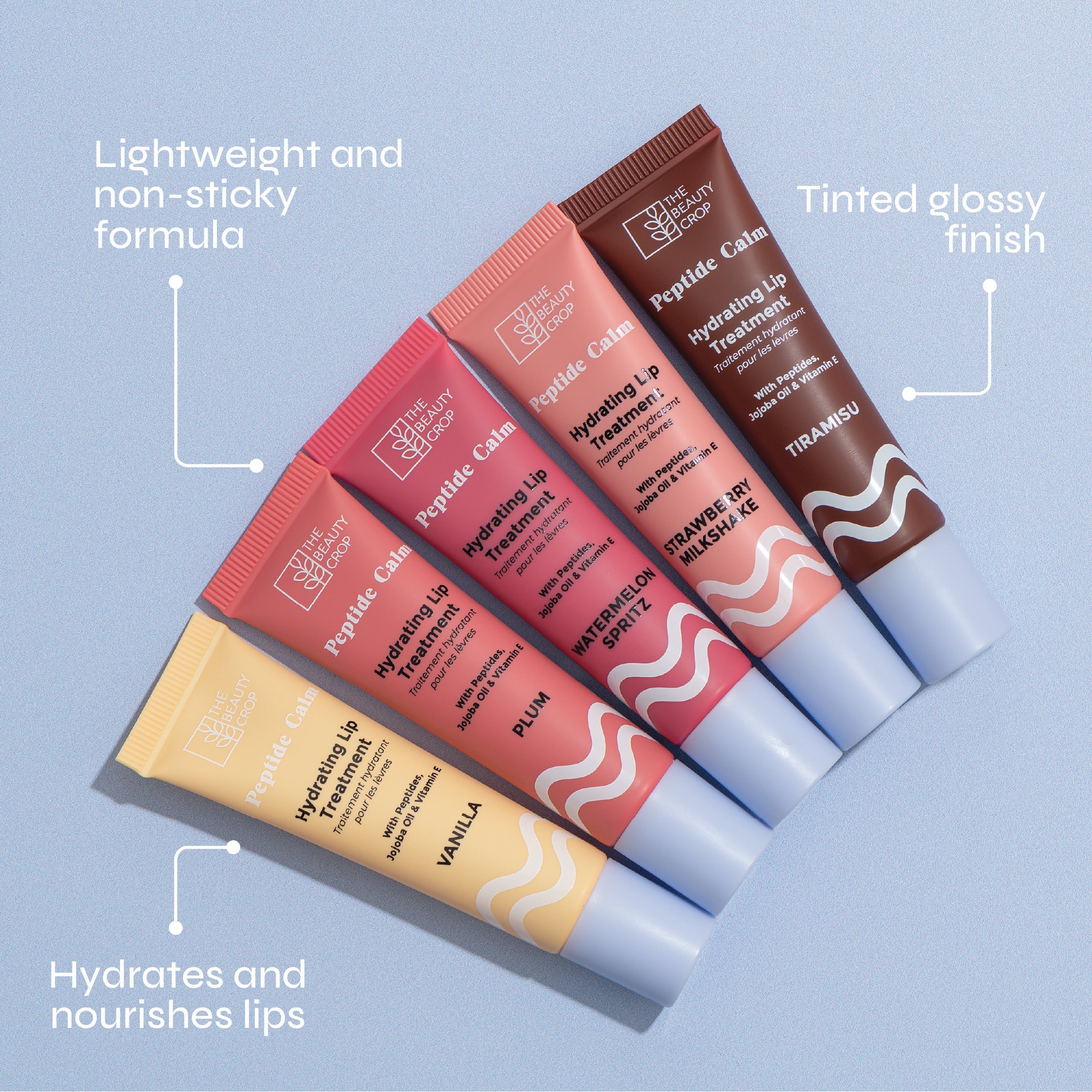 Unlock the secret to irresistibly hydrated, glossy lips with our new and improved Peptide Calm Lip Treatments. Packed with Peptides, Vitamin E and Jojoba Oil, this nourishing, non-sticky formula helps hydrate, smooth and plump your pout, while delivering a sheer, buildable tint for the perfect touch of colour. To make application effortless, we’ve upgraded to a silicone tip applicator which glides smoothly over your lips, hugging every curve for a flawless, even finish with no corner left behind. Enjoy indulgent scents s like juicy Plum, sweet Strawberry Milkshake and creamy Tiramisu that keep your lips looking, feeling and smelling delicious all day long.Compact and perfectly pocket-sized, these lip treatments are ready to become your go-to for a quick burst of shine and sweetness whilst on the move!